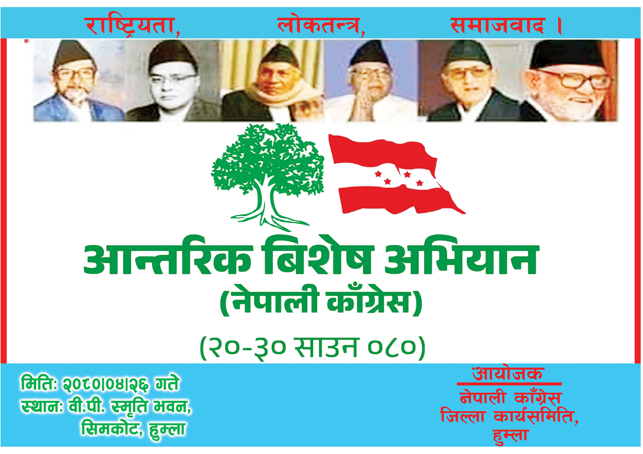 हुम्ला जिल्लामा आन्तरिक विशेष अभियान २०८० भव्यरुपले संचालन भएको छ । जिल्लाका ७ वटा गाउँपालिका र ४४ वटै वडाका नेपाली काँग्रेसका नेता कार्यकर्ताहरुको उपस्थित रहेको थियो । नेपाली काँग्रेसको केन्द्रिय कार्यसमितिको साउन २ गते देखि १० गते सम्म चलेको ...