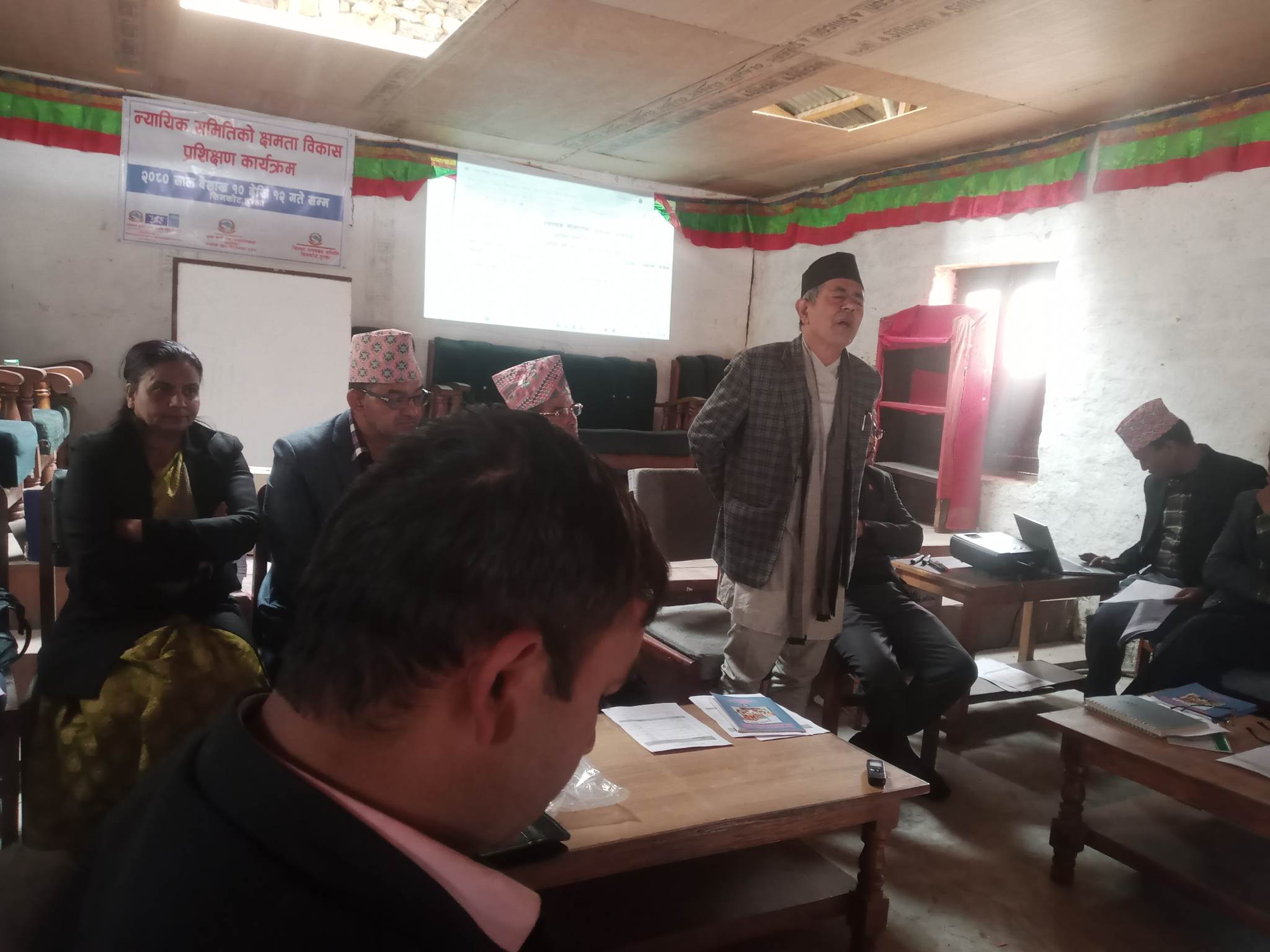 उक्त तालिममा स्थानिय न्यायीक समितिले न्याय संपादन गर्दा अपनाउनु पर्ने भुमिका किनारा लगाउने तरिका र मुद्दा दर्ता गर्ने प्रक्रियाका बारेमा सिकाइने भएको छ ।