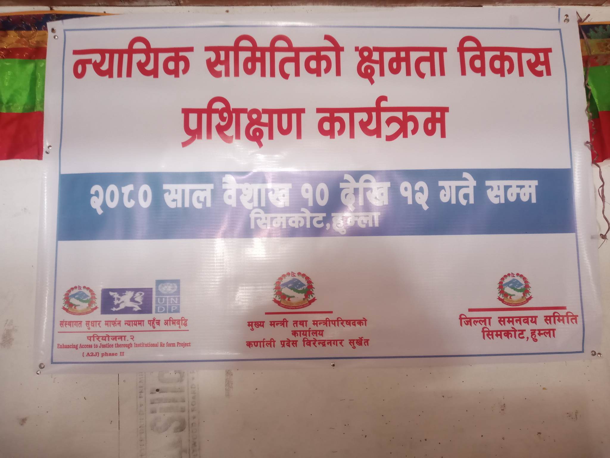संस्थागत सुधार मार्फत न्यायमा पहुँच अभिवृद्धि परियोजना, मुख्यमन्त्री तथा मन्त्री परिषदको कार्यालय कर्णाली प्रदेश र जिल्ला समन्वय समिति सिमकोटको संयुक्त आयोजनामा संचालित न्यायिक समितिको क्षमता विकास प्रशिक्षण कार्यक्रमको प्रमुख आतिथ्य जिल्ला समन्वय समितिका उपप्रमुख दलु फडेराको रहेको थियो । जिल्लामा दुई सिफ्टमा तालिम संचालन हुनु पर्ने, हुम्ला जिल्ला प्रदेश निर्वाचन क्षेत्र क का ४ वटा गाउँपालिकाको एक सिप्ट र ३ वटा गाउँपालिकाको एक सिप्ट गरी तालिम संचालन गर्दा प्रभावकारी हुने, स्थानीय तहमा न्यायिक प्रणाली लागु गर्न नेपाल सरकारका मुख्य सरोकारवालाहरू जस्तो सङ्खीय मामिला तथा स्थानीय प्रशासन मन्त्रालय, कानून, न्याय तथा संसदीय मामिला मन्त्रालयका साथै सर्वोच्च अदालत, मेलमिलाप परिषद् तथा जिल्ला अदालतको भूमिका तथा जिम्मेवारीहरूमा स्पष्टता, यी सबैमा एक किसिमको समझदारी तथा सहमति सिर्जना गरिनुपर्छ । यी निकायहरूले आफ्ना विद्यमान विधायिकी तथा कार्यक्रमिक कार्यादेशको अतिरिक्त अभियानले सहकार्य, अधिकतम प्रभावकारिता तथा अझै बढी रणनीतिक भई न्यायमा पहुँचका लागि एकसाथ काम गर्न तिनलाई सहयोग गर्नेछ । यसो गर्दा न्यायिक समितिका सदस्यलाई पनि छलफलमा राखेर तिनीहरूको व्यावहारिक अनुभवलाई आधार बनाउन भने बिर्सन नहुने जिल्ला समन्वय समितिका उपप्रमुख दलु फडेरा बताएका थिए ।