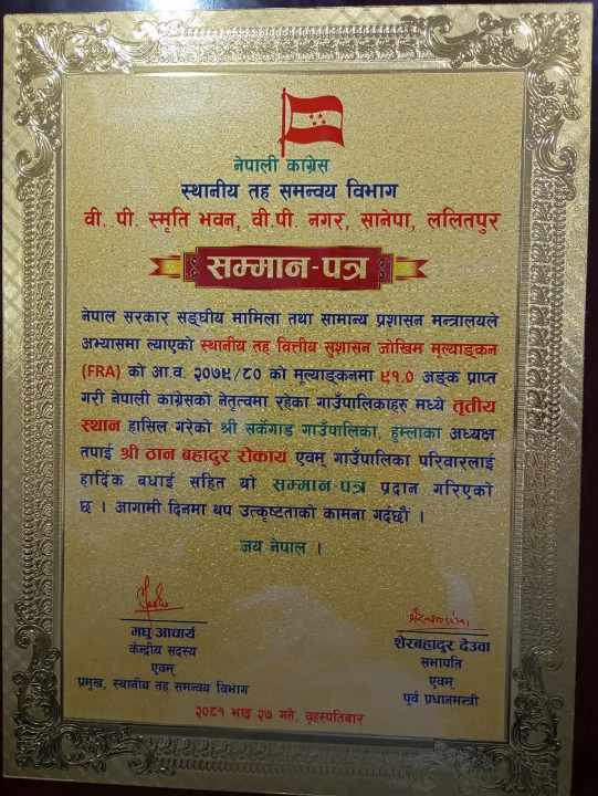 नेपालको संघीय संरचना,राज्य पुनसंरचना पछी निर्मित नेपालको संविधान २०७२ कार्यन्वयन गरी नागरिकहरुको परिवर्तनको आशा र ग्रामिण विकासलाई सिंह दरबार संग जोड्ने पुलको रुपमा दुरदराज बाट महत्वपूर्ण कार्य गरेको प्रति पार्टी सभापति देउवाले प्रशंसा गरेका थिए । यस अघि उत्कृष्ट गाउँपालिकाको अवार्ड सङै नेपाल सरकारले अध्यक्ष रोकायलाइ सिङ्ग्पुर, मोलसिया लगायतका देशहरुमा दीर्घकालीन बिकासको मुल्यांकन गर्न भ्रमणमा पठाएको थियो।