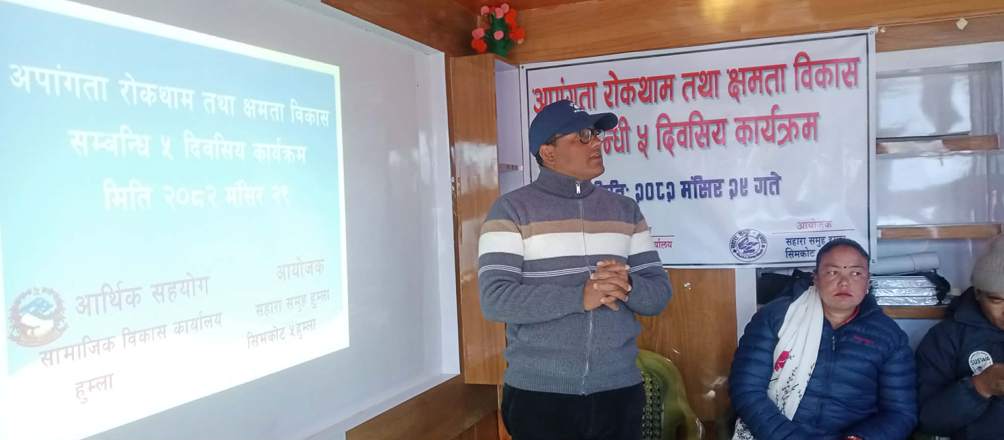 अपाङ्गता रोकथाम तथा क्षमता विकास सम्बन्धीको ५ दिने अनुशिक्षण कार्यक्रम सुरु भएको छ । सामाजिक विकास कार्यालयको आर्थिक सहयोग र सहारा समुहको आयोजनामा उक्त कार्यक्रम हुम्ला जिल्लाको सदरमुकाम सिमकोटमा संचालन भएको हो . पहिला पहिला फरक क्षमता भएका व्यक्तीहरुलाई उनको प्रकृती हेरेर गाइ गोरु गोठालो लगाउने,घरमै बाँधेर राख्ने गरिएकोमा अहिले नेपाल सरकारबाट फरक क्षमता भएका व्यक्तीहरुको पहिचान गरी उनीहरुको स्वास्थ्य उपचार, शिक्षा दिक्षा सहज ढंगले दिने गरेको प्रहरी नायव उपरिक्षक संकर खड्काले बताएका छन् ।