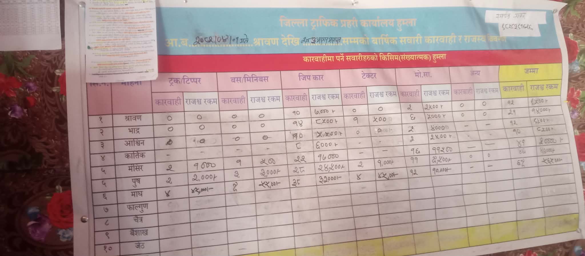चालु आर्थिक वर्षको साउनमा ९ हजार ५ सय, भाद्र महिनामा १४ हजार, असोज महिनामा ९ हजार ५ सय, कार्तिक महिनामा ८ हजार ५ सय, मंसिर महिनामा ३० हजार, पौष महिनामा४० हजार र माघ महिनामा ५६ हजार ५ सय गरी जम्मा १ लाख ६८ हजार राजस्व संकलन गरेको ट्राफिर प्रहरी प्रमुख विष्ठले बताएका छन् ।