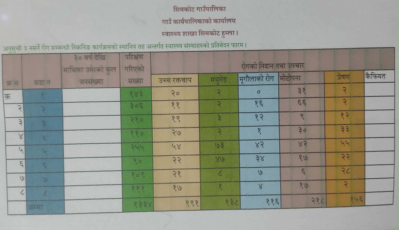 जस अनुसार सिमकोट गाउँपालिका वडा नं १मा परिक्षण गरिएको जम्मा संख्या १ सय ४३ जना मध्य उच्च रक्तचाप २०, मधुमेह २, मृगौलाको रोग ०, मोटोपना ३१, प्रेषण २ जना शाखा प्रमुख भण्डारीले बताएका छन् । सिमकोट गाउँपालिका वडा नं २मा परिक्षण गरिएको जम्मा संख्या ३ सय ६ जना मध्य उच्च रक्तचाप ११, मधुमेह २, मृगौलाको रोग १६, मोटोपना ६६, प्रेषण २ जना, वडा नं ३ मा परिक्षण गरिएको जम्मा संख्या २ सय १० जना मध्य उच्च रक्तचाप १९, मधुमेह ३, मृगौलाको रोग १२, मोटोपना ९, प्रेषण ३३ जना वडा नं ४ मा परिक्षण गरिएको जम्मा संख्या १ सय १० जना मध्य उच्च रक्तचाप २७, मधुमेह २, मृगौलाको रोग १, मोटोपना ३०, प्रेषण ३३ जना, वडा नं ५ मा परिक्षण गरिएको जम्मा संख्या २ सय ५५ जना मध्य उच्च रक्तचाप ५४, मधुमेह ७३, मृगौलाको रोग ४२, मोटोपना ४२, प्रेषण ५५ जना, वडा नं ६ मा परिक्षण गरिएको जम्मा संख्या ९० जना मध्य उच्च रक्तचाप २२, मधुमेह ४७, मृगौलाको रोग ३४, मोटोपना १७, प्रेषण २२ जना, वडा नं ७ मा परिक्षण गरिएको जम्मा संख्या १ सय १ जना मध्य उच्च रक्तचाप २१, मधुमेह ८, मृगौलाको रोग ७, मोटोपना ६, प्रेषण २८ जना र वडा नं ८ मा परिक्षण गरिएको जम्मा संख्या १ सय ९१ जना मध्य उच्च रक्तचाप १७, मधुमेह १, मृगौलाको रोग ४, मोटोपना १७, प्रेषण २ जना रहेको शाख प्रमुख भण्डारीले बताएका छन् ।